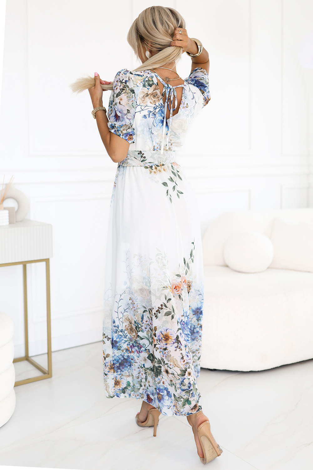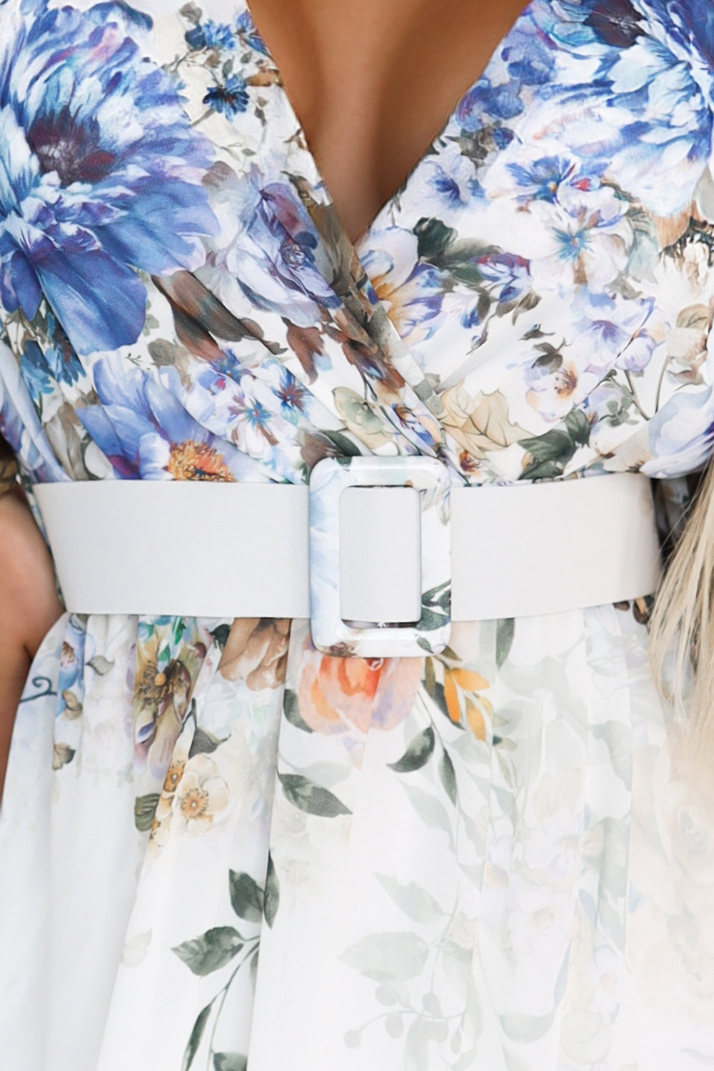 613-1 CELINA Gaisīga maksi kleita ar aploksnes kakla izgriezumu, jostu un ziedu rakstu ombre rakstu - gaiši zila
