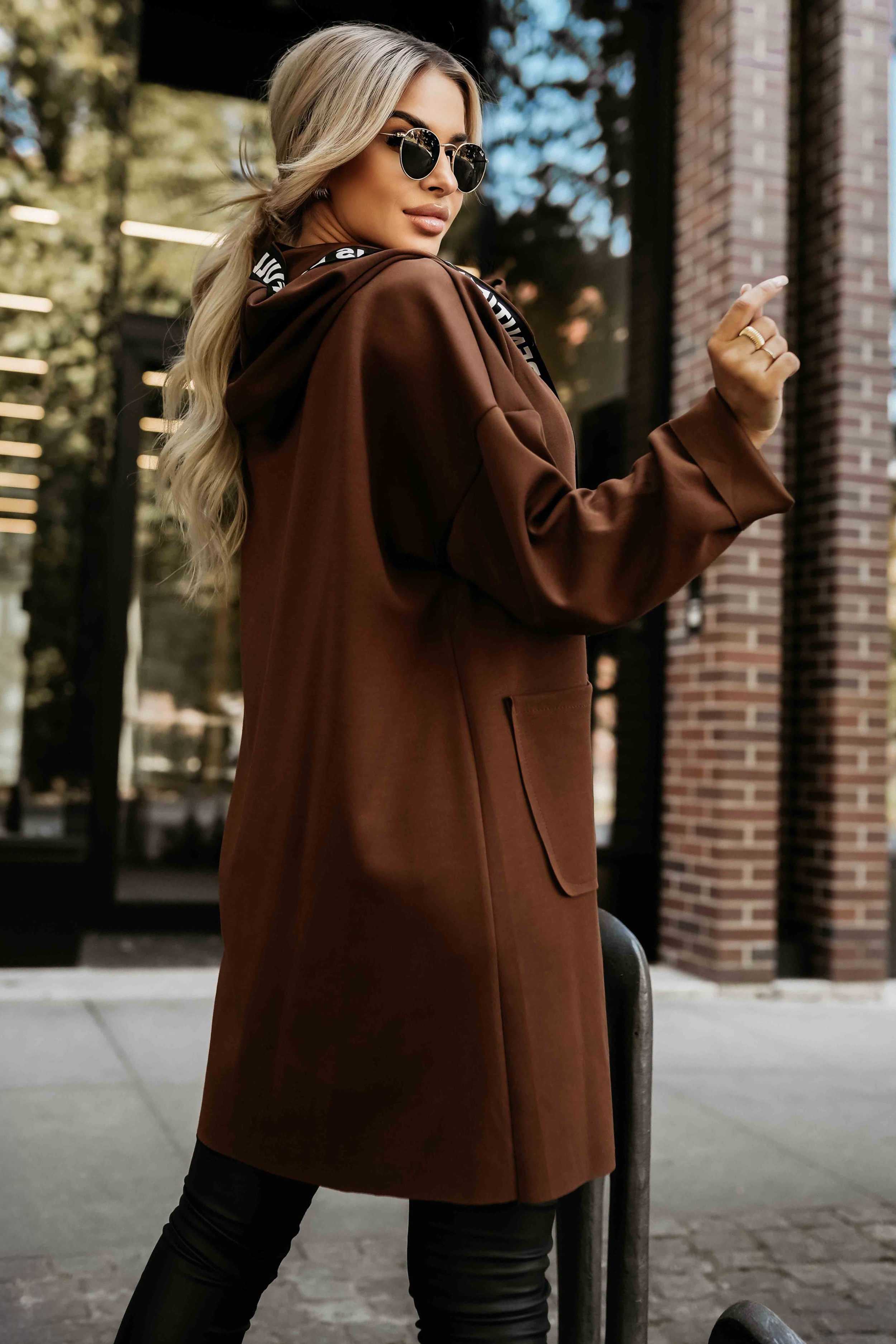 Brīvais piegriezums nodrošina kustību brīvību, bet praktiskās kabatas piešķir tam pilsētas raksturu. Šokolādes tonis piešķir tērpam eleganci un padara mēteli lieliski piemērotu gan sportiskiem, gan elegantākiem stiliem.