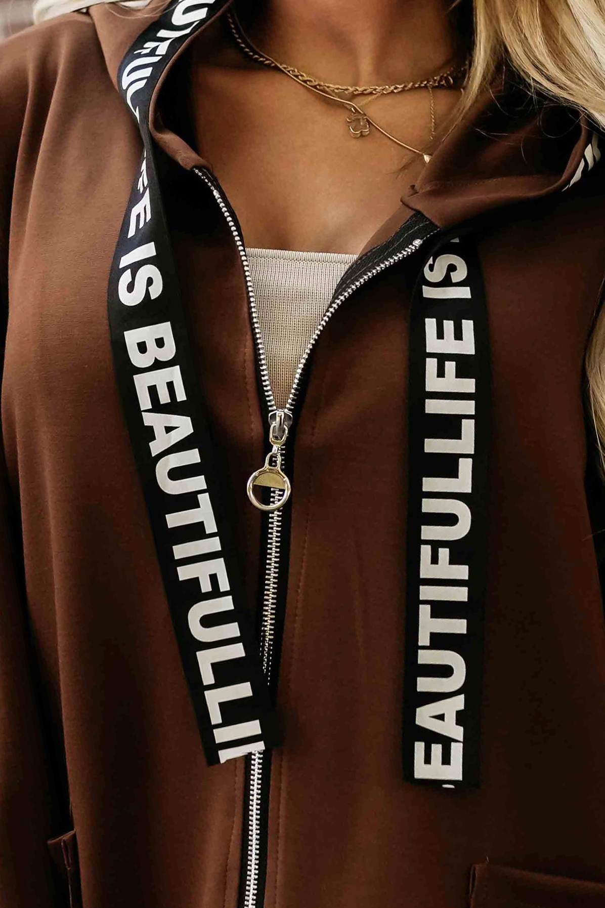 Atklājiet moderno stilu un komfortu – sieviešu mētelis no zīmola Numoco Basic ir ideāla ikdienas brīvības un modernu detaļu kombinācija. Šūts Eiropā, pievēršot uzmanību katrai detaļai, tas pārsteidz ar efektīgiem uzrakstiem BEAUTIFUL LIFE uz kapuces lentēm un funkcionālu rāvējslēdzēju.