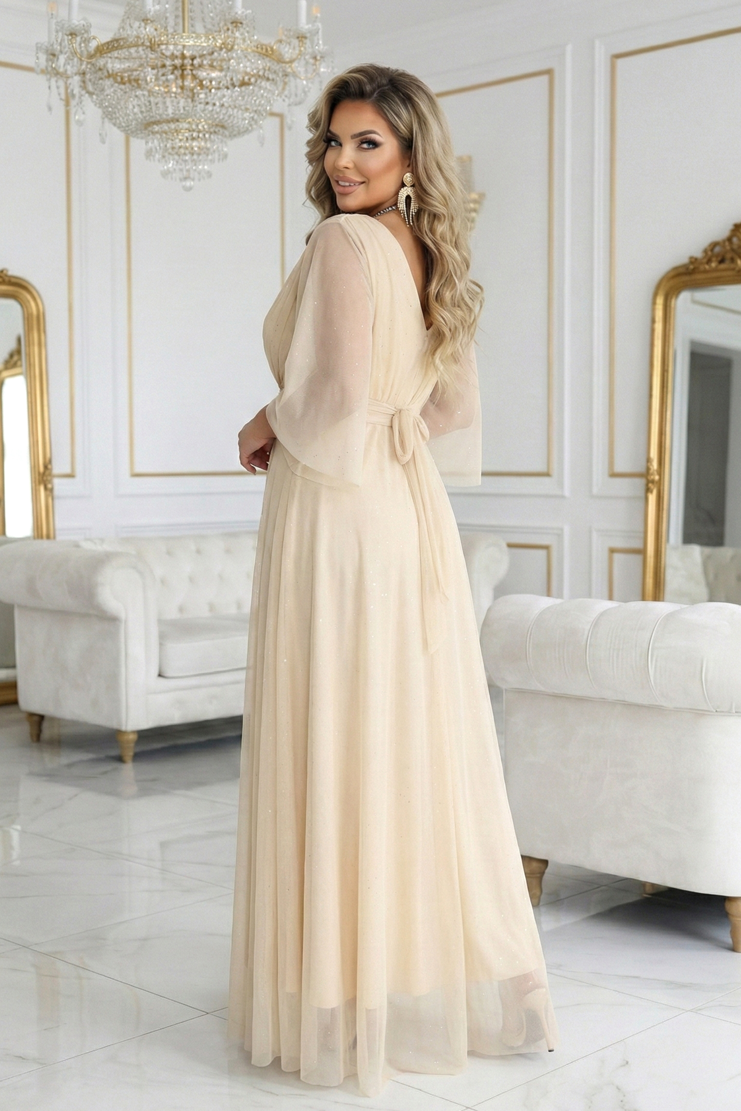 Maxi kleita šampanieša bēšā krāsā ar caurspīdīgu piedurkni un saiti vidū - Numoco Basic